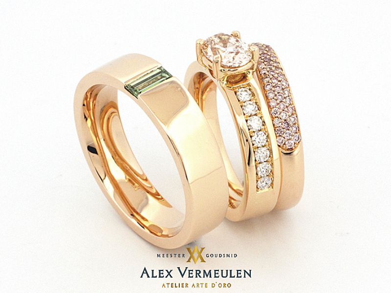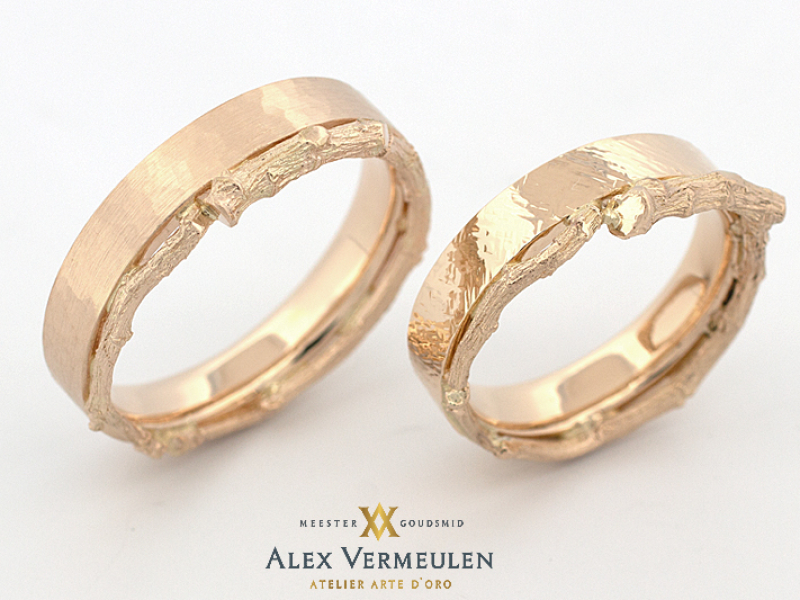 Bijzondere ontwerpen van unieke trouw of relatie ringen, in opdracht gemaakt van Fair-trade goud of platina door meestergoudsmid Alex Vermeulen, atelier/juwelier te Nijmegen, Gelderland.