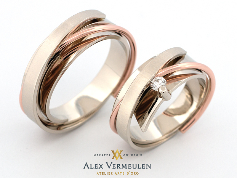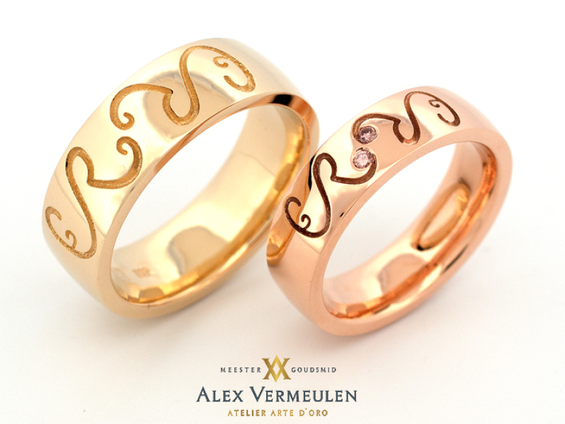 Bijzondere ontwerpen van unieke trouw of relatie ringen, in opdracht gemaakt van fair-trade goud of platina door meestergoudsmid Alex Vermeulen, atelier/juwelier te Nijmegen, Gelderland.